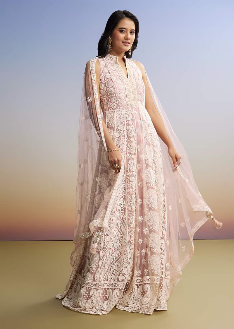 Romantic, dreamy, and dazzlingβthis blush pink anarkali gown is designed to enchant every room it enters. πΈ The outfit is adorned with delicate ivory embroidery, floral motifs, and lace detailing that cascade across the bodice and flare, creating an ethereal fairytale silhouette. The pastel hue whispers softness, while the detailed threadwork sings of richness and sophistication. π· The flowing fabric sways with effortless movement, giving a heavenly aura as though one is walking through blossoms in a spring garden. The sheer dupatta, kissed with floral patterns and tassels, drapes beautifully, adding layers of charm and femininity. πβ¨ Paired with statement earrings and bangles, this attire makes for a perfect ensemble for bridesmaids, pre-wedding functions, or festive celebrations under the twilight sky π . More than just an outfit, it is a dream spun in pastel threads, embroidery, and magic, perfect for the modern woman who desires tradition wrapped in elegance. ππΈ